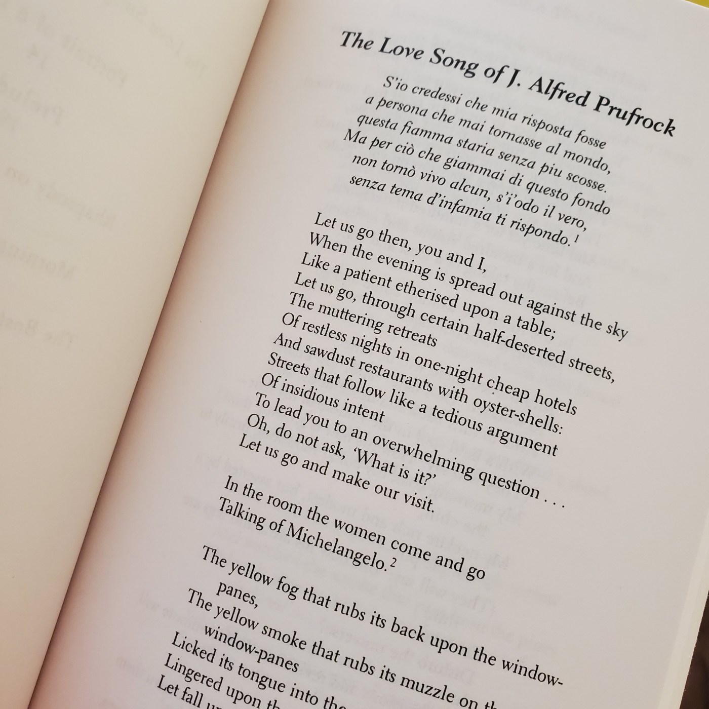 “The Love Song of J. Alfred Prufrock” by T.S. Eliot is one of my favorite poems. I first read it in my eleventh grade English class, where I was fortunate to have a teacher who made me learn to love studying and analyzing literature. I had always loved to read, but English classes in school were underwhelming, as we would never have those kinds of discussions where we talked about what a story or poem meant for us and what we could learn about life from it.